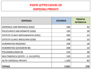 Nell’emergenza si è fatto appello anche alle strutture private-convenzionate che, secondo la comunicazione rilasciata lo scorso 13 marzo dal Presidente dell’AIOP (Associazione Italiana Ospedalità Privata), hanno messo a disposizione 270 posti letto, come riportato nella tabella che pubblichiamo:
