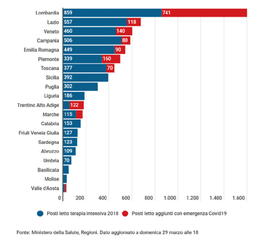 Molto più numerosi, nonostante i tagli, sono stati i posti in terapia intensiva nel settore pubblico nella regione, che in data 29 marzo 2020 erano 1.600, mentre nel 2018 erano 859.